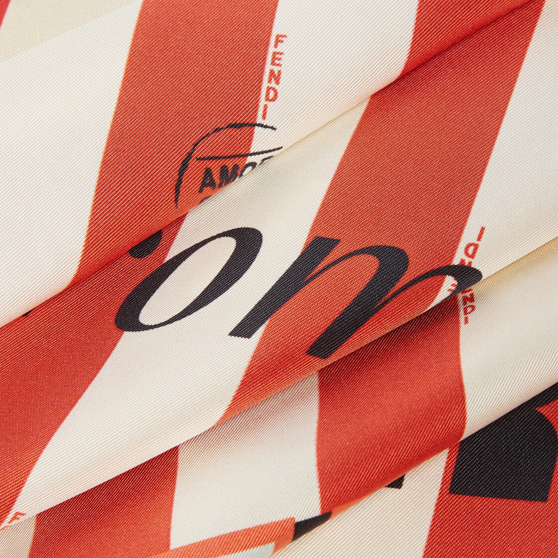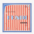 方形真絲圍巾。特別綴以FENDI Pequin Postcard圖案:在象牙白與鏽色的Pequin條紋背景上,以淺藍色條紋搭配中央藍色呈現超大FENDI標誌,重新詮釋義大利經典傳承。以色塊條呈現格紋式樣。手工飾邊。