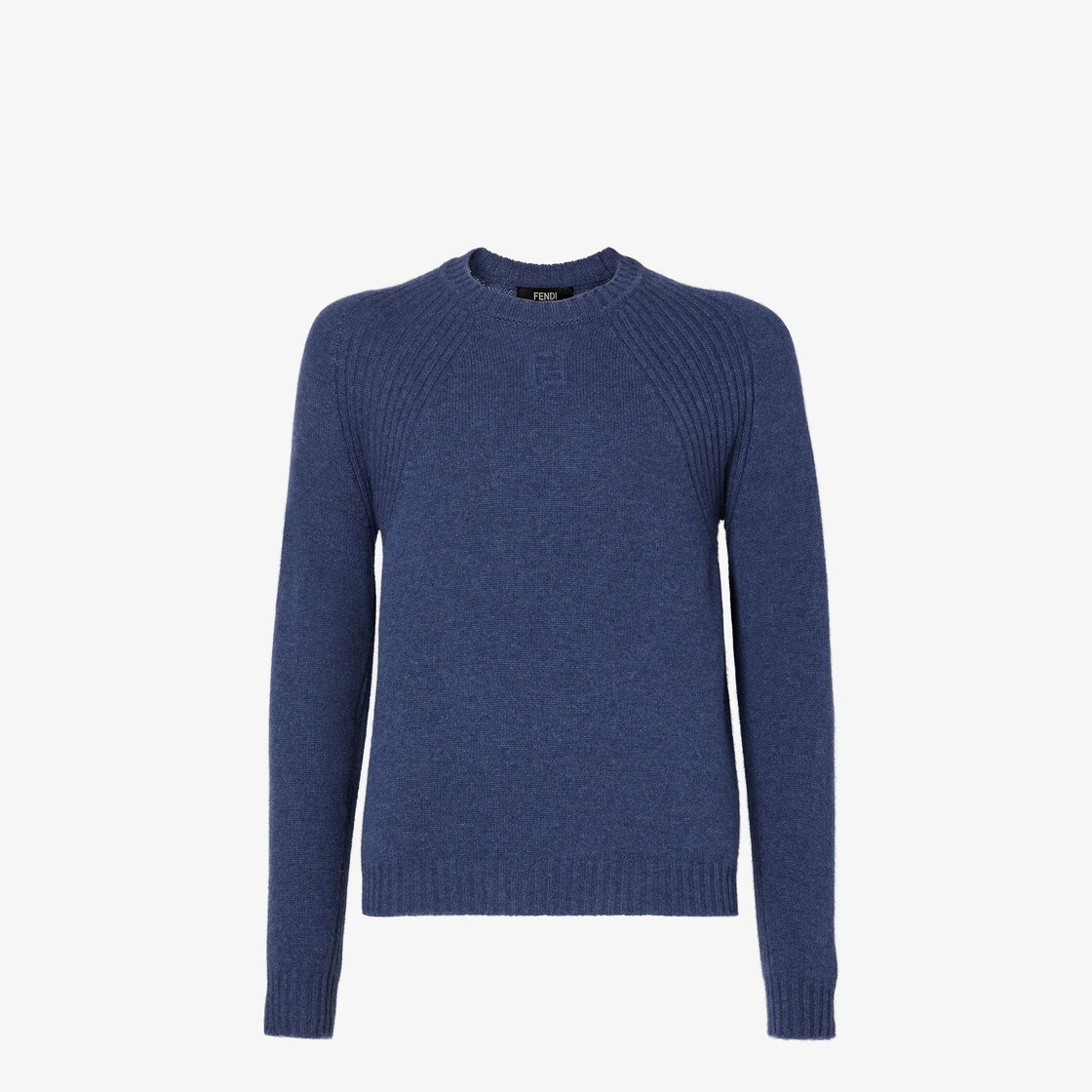 長袖船領毛衣。中型款式。羅紋飾邊。採用空軍藍羊絨紗線製成,針織工藝勾勒出立體的插肩剪裁與腋下線條。胸前中央綴有壓花微型FF細節。