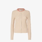 長袖圓領開胸外套。同色系包覆式鈕扣開合。米色棉質紗線製成,搭配滿版Argyle圖案刺繡和鏤空FF細節。羅紋袖口和衣緣,圓領綴有紅色條紋圖案。