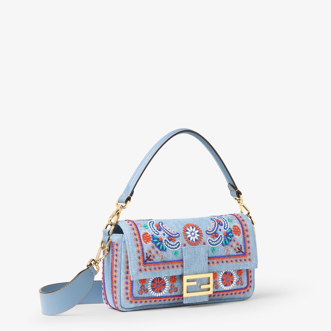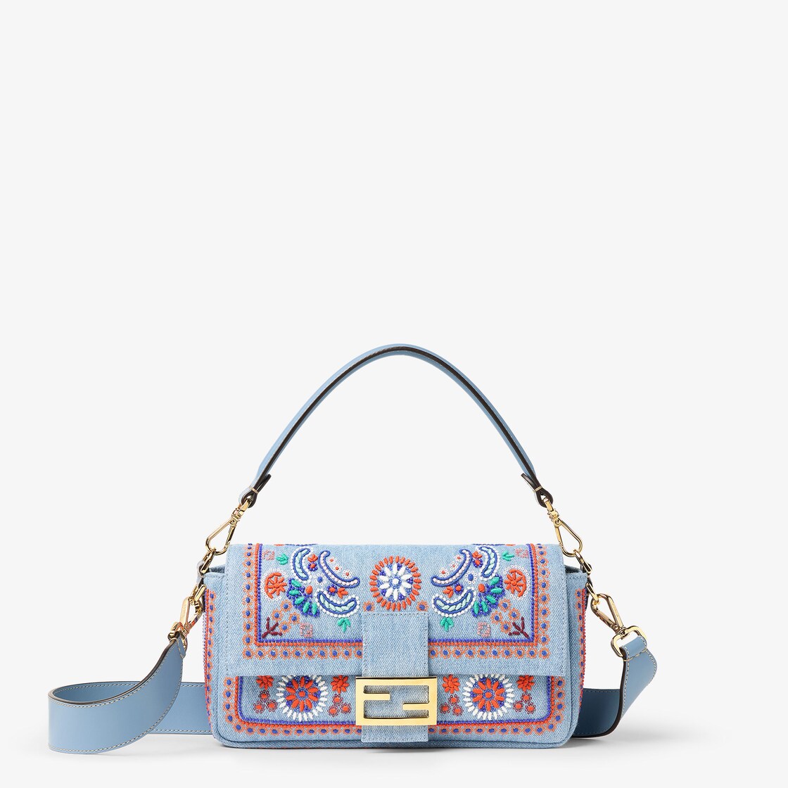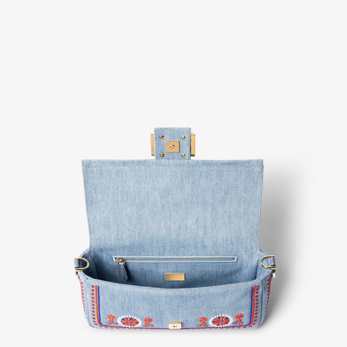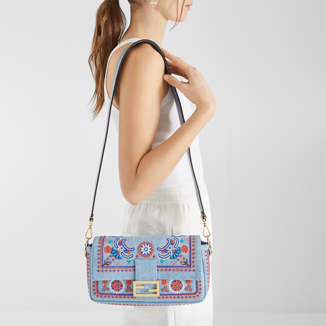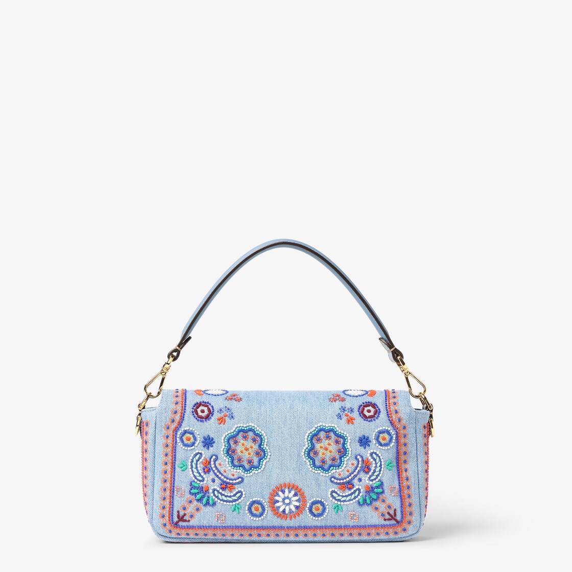 以有機棉質丹寧製成,呈現淺藍色水洗效果,並以6300多顆形狀、尺寸和顏色各異的玻璃珠與亮片點綴精緻刺繡,令人聯想起精美的威尼斯千花玻璃。飾有FF鉤扣。