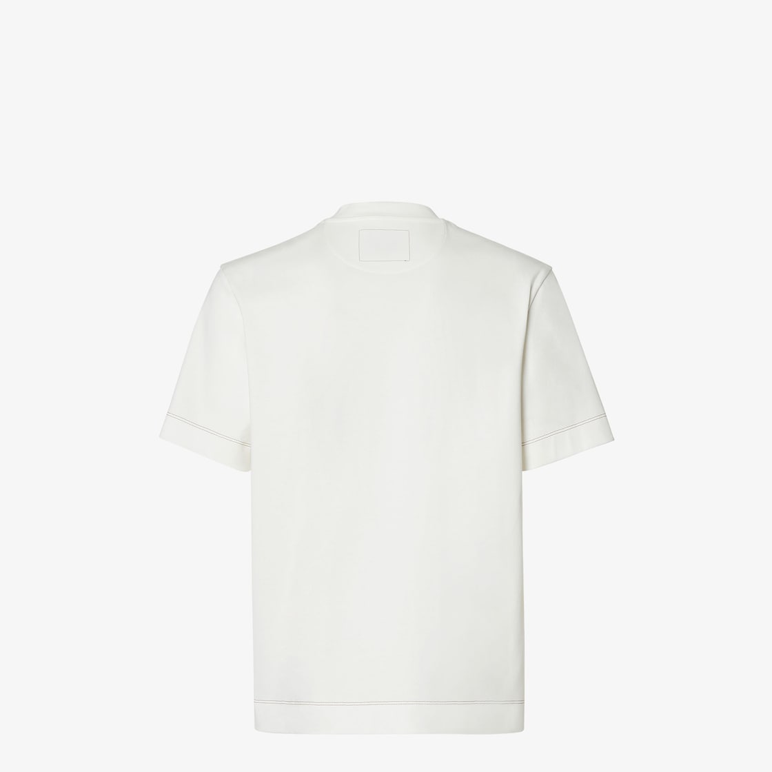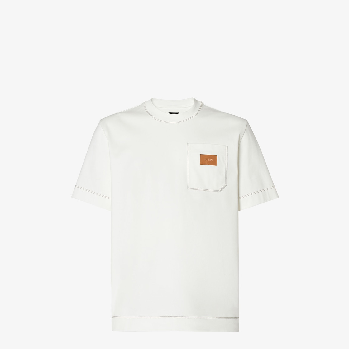 中型款式短袖圓領T恤。白色純棉布料製成。特別設計的左側胸前口袋綴有皮革FENDI標飾,衣領背面綴有jacron縫線圖案。對比明縫線處理。