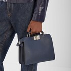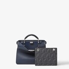 The interior is organised into two compartments divided by a stiff partition, the front features the iconic twist lock, and there is a zip fastening on the back. The removable interior pocket is made of Mercury blue leather on one side and black FF Canvas on the other. Palladium-finish metalware.