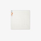 White cotton baby blanket with hand-crocheted rainbow "Fendi" embroidery.