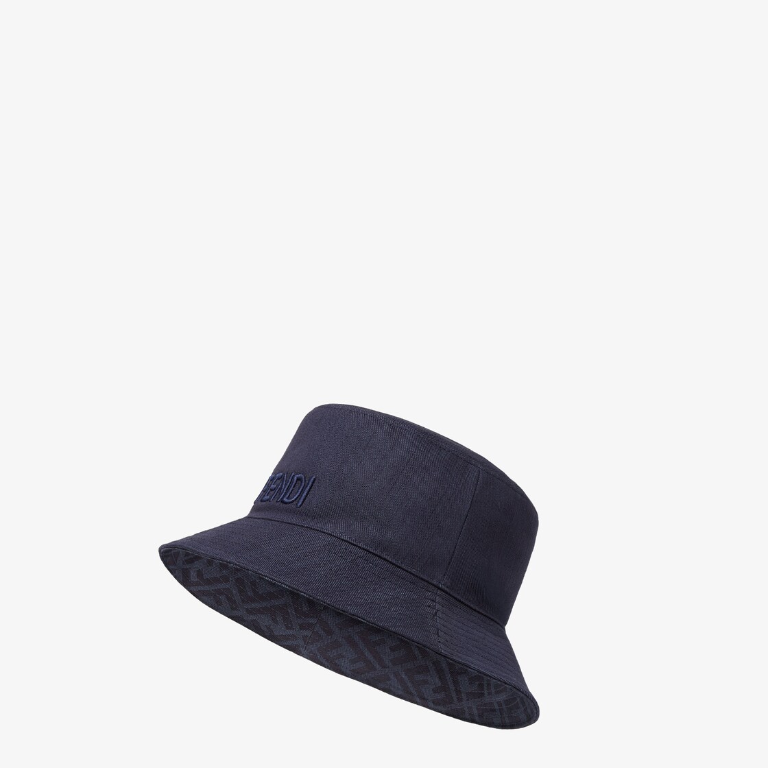 Narrow-brimmed bucket hat made of a dark blue cotton denim. One side is customised with the iconic all-over FF motif, the other with the Fendi logo embroidered in the same tone on the front.