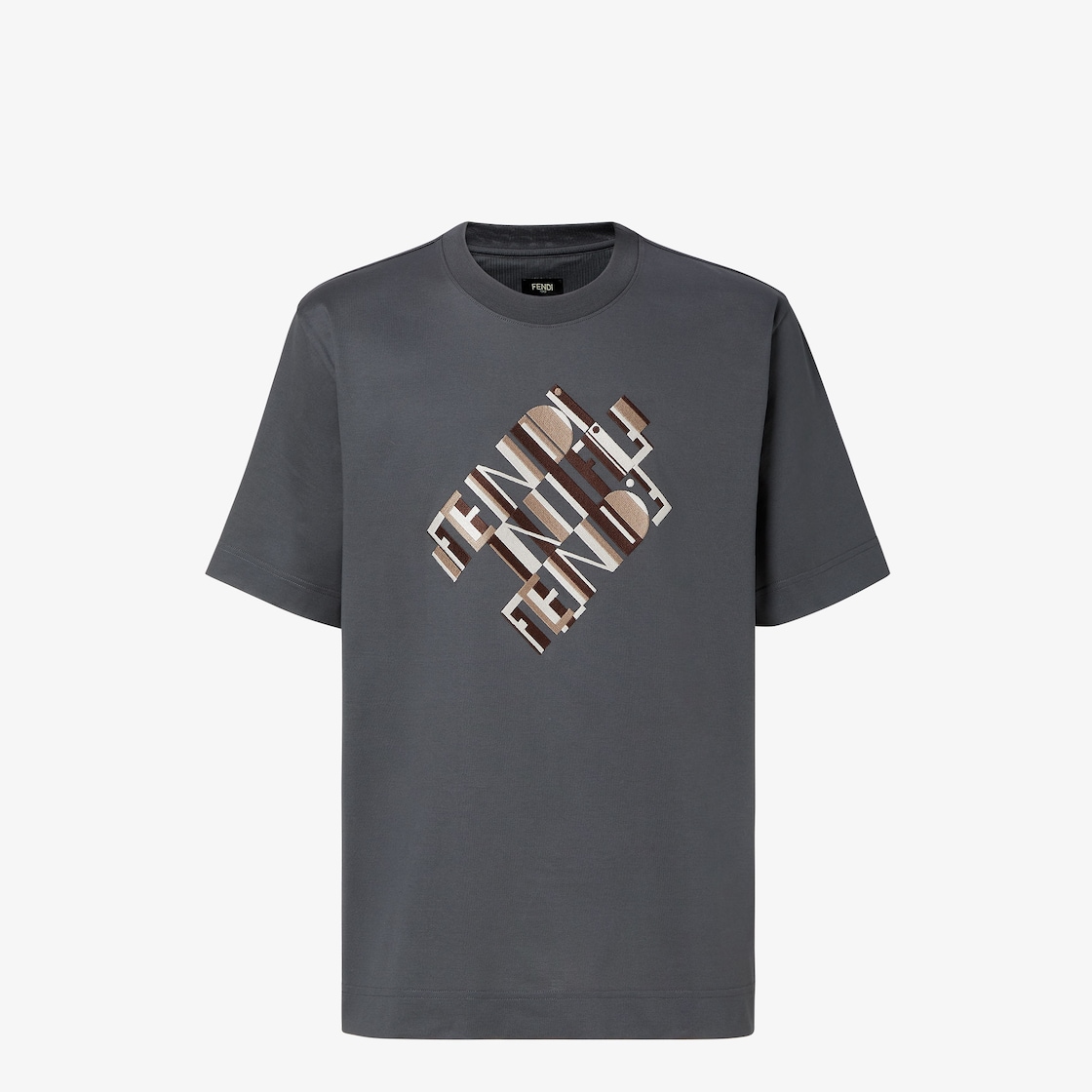 Regular-fit, short-sleeved crew-neck T-shirt. Made of grey 100% cotton. Customised the Fendi Tape motif and embroidered details in brown, beige and white, inspired by the 1920s, with diagonals that recall interlacing ribbons and the maximalist aesthetic of the 2000 Fendi fashion show.