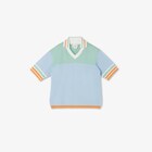 Junior polo shirt in a light blue cotton knit with multicoloured stripes on the waist and sleeves in orange and light green. White and multicoloured striped collar and green detail on the front. Tone-on-tone Fendi logo on the front.