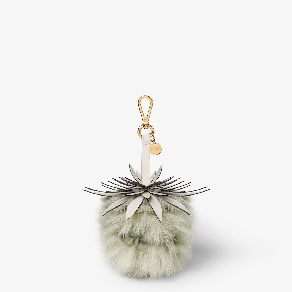 Fendi Pineapple charm with leather strap, clip and tag customised with the Fendi logo. Made of light green fox and rabbit fur. Gold-finish metalware. Ideal as an accessory for bags and key rings.