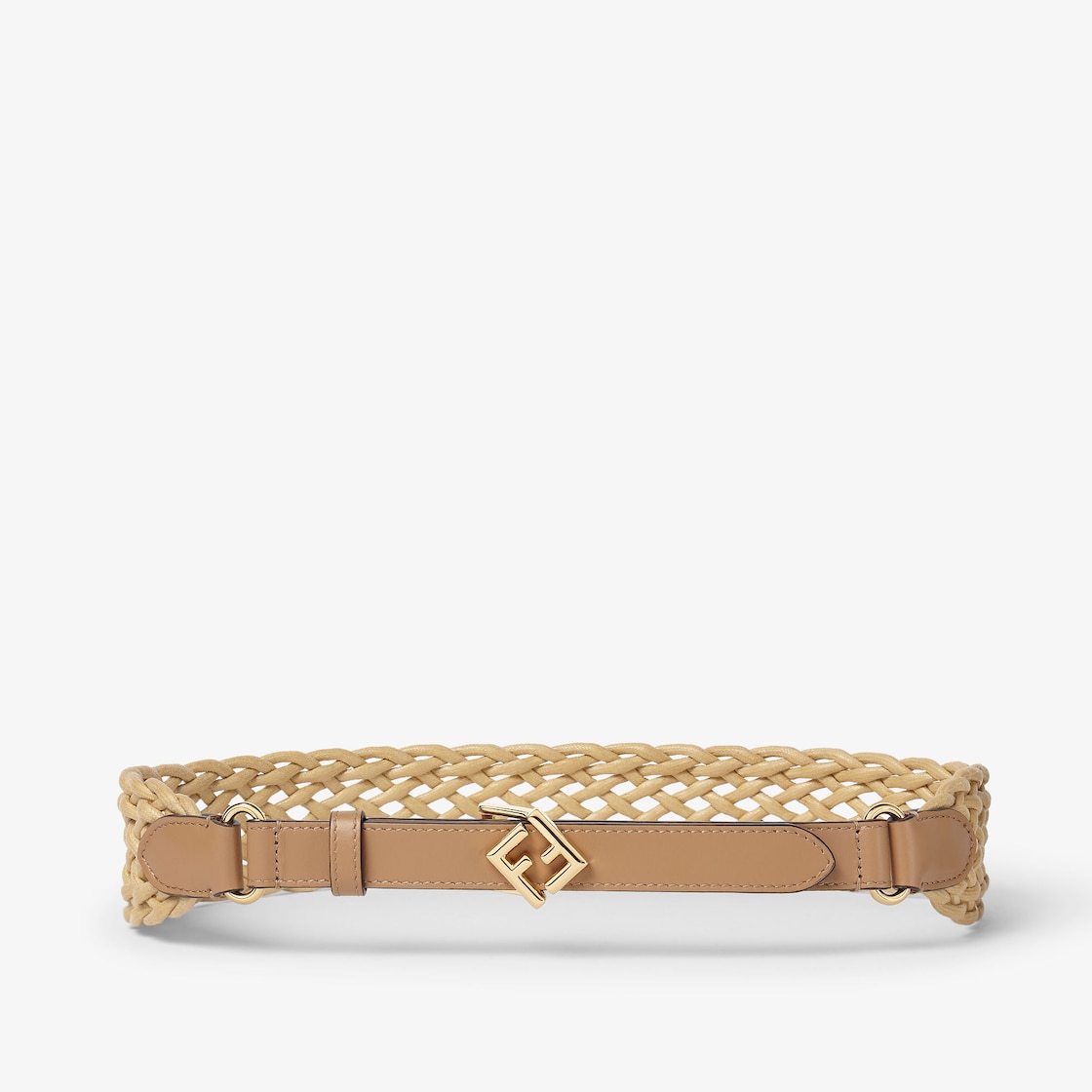 Belt with loop and diagonal FF stud buckle. Made of beige leather with braided back strap. Gold-finish metalware.