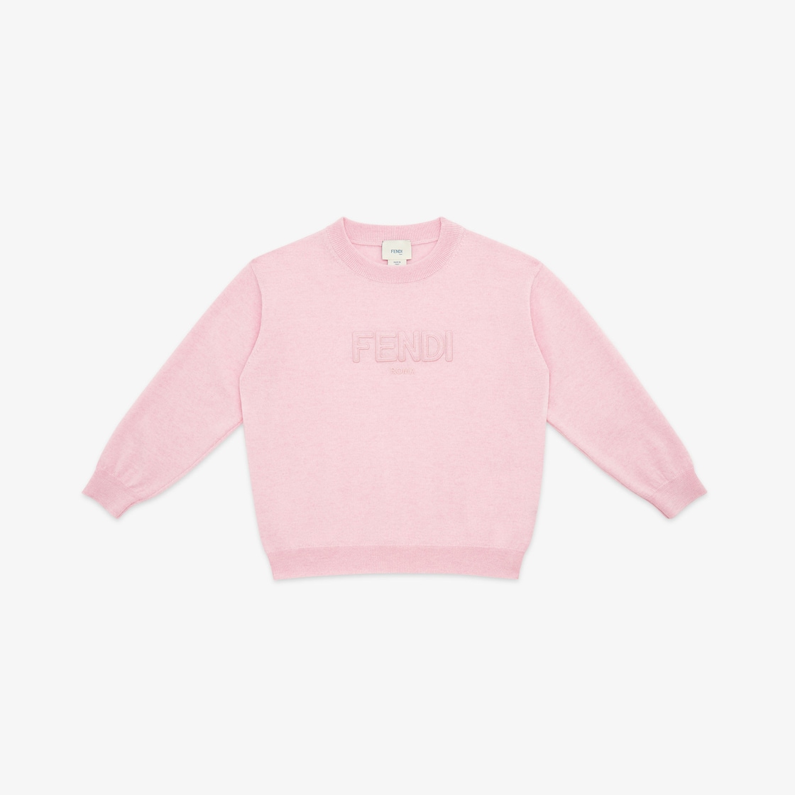 Lightweight pink wool crew-neck junior jumper with tone-on-tone Fendi embroidery on the front.