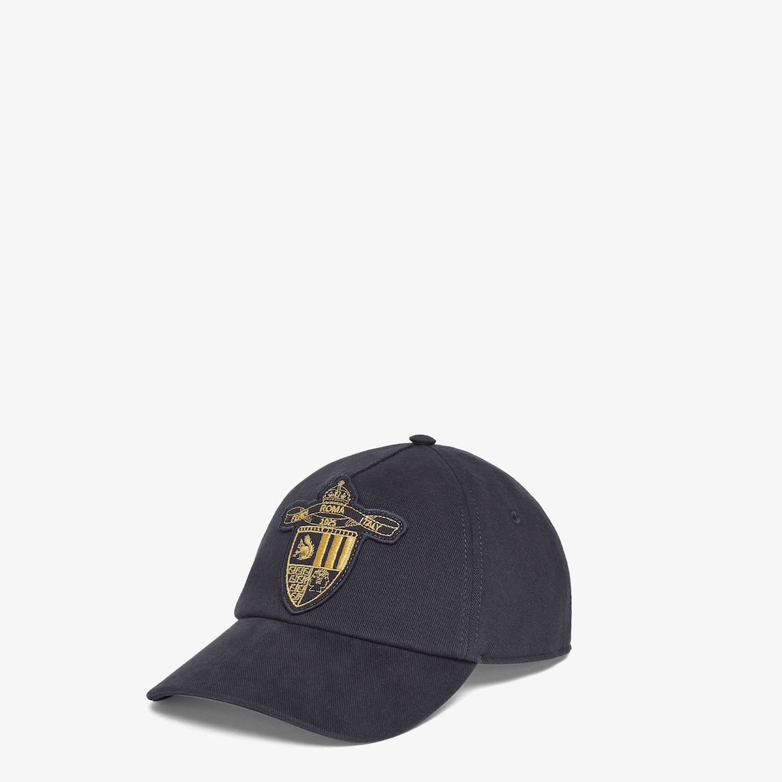 Baseball cap with semi-stiff peak. Velcro strap closure at the back. Made of blue cotton canvas. The Fendi Crest, embroidered and applied on the front, is the Fendi Club emblem designed by Silvia Venturini Fendi to celebrate the brand’s centennial. An exclusive symbol of a family tradition that has redefined the concept of elegance and sport.