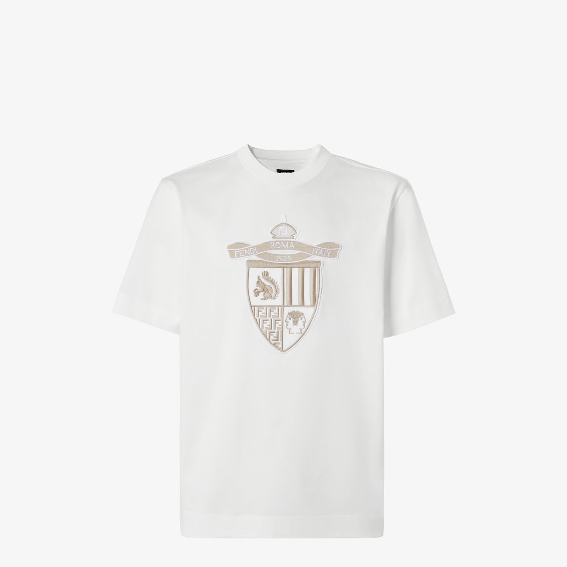 Short-sleeved, crew-neck, oversized T-shirt. Made of white pure cotton. The Fendi Crest, embroidered and applied on the chest, is the Fendi Club emblem designed by Silvia Venturini Fendi to celebrate the brand’s centennial. An exclusive symbol of a family tradition that has redefined the concept of elegance and sport.