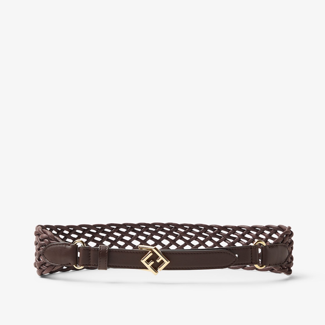 Belt with loop and diagonal FF stud buckle. Made of brown leather with braided back strap. Gold-finish metalware.