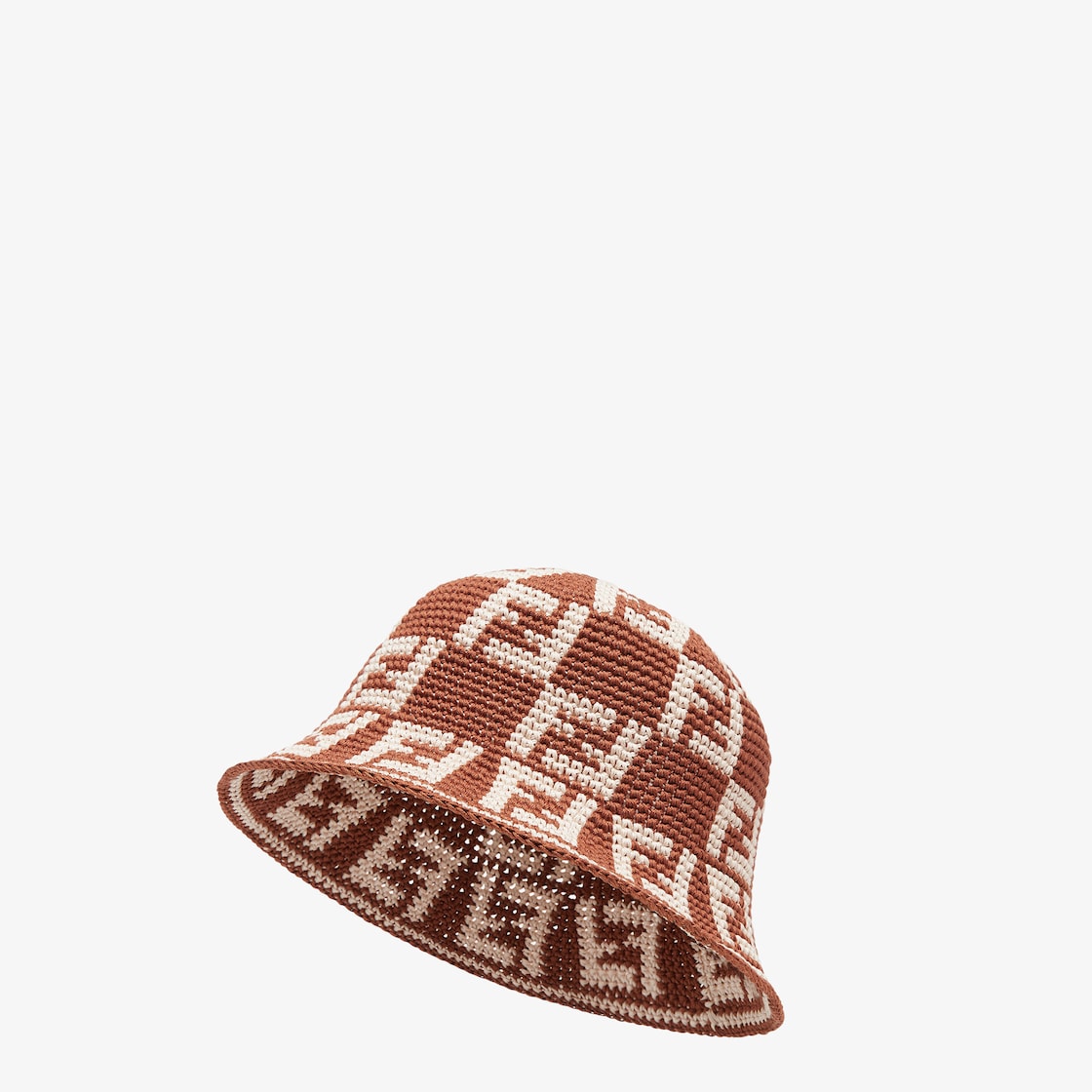 Cotton handmade narrow-brimmed cloche hat. The crochet reproduces the iconic all-over FF motif in brown and beige.