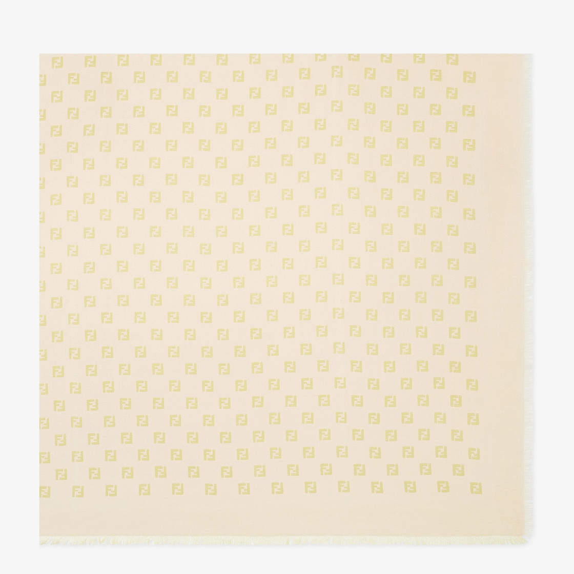 Large shawl made of a soft silk and wool blend in beige and sorbet yellow. The innovative printing technique makes it possible to have a double-faced shawl embellished with contrasting-coloured micro FF jacquard workmanship. One side is beige, the other is sorbet yellow. Lightweight and wraparound, suitable for all seasons. Embellished with fringed border.