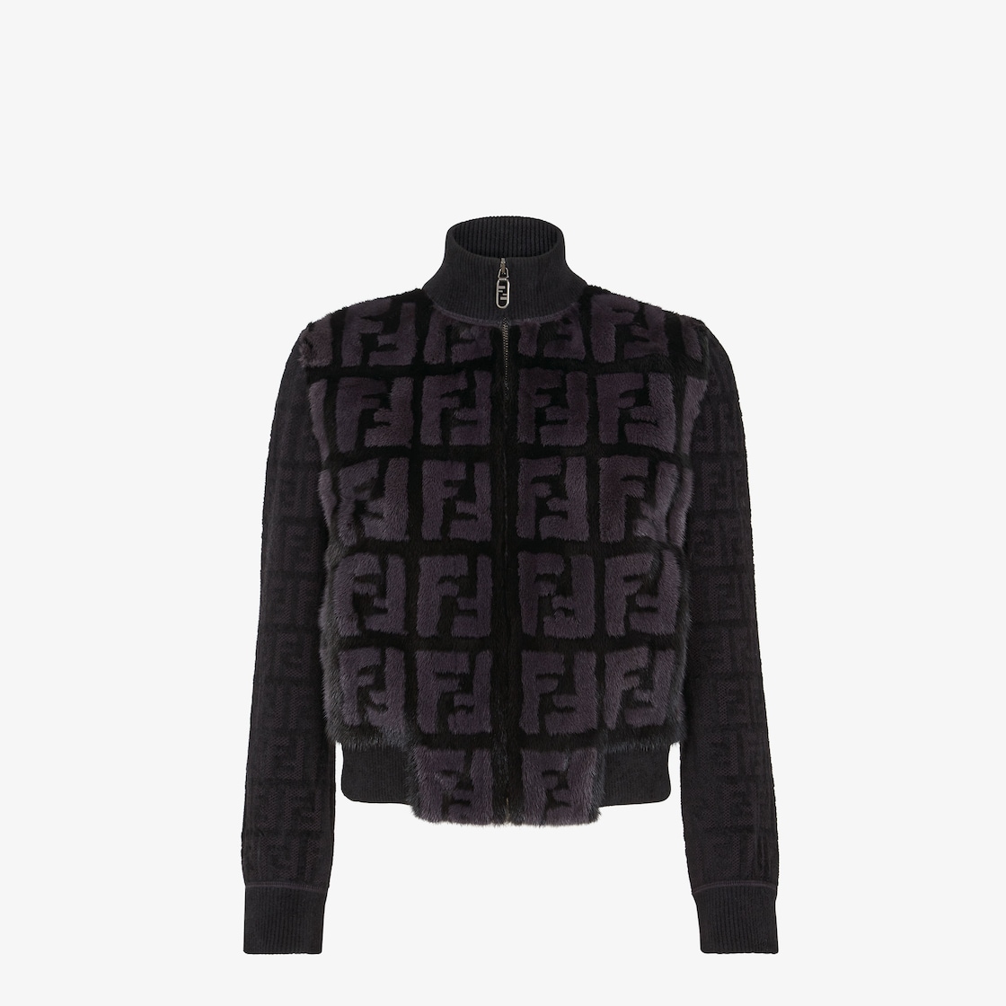 Bomber jacket with zip fastening. High collar, cuffs and garment hem in stretch fabric. Made of a velvet and viscose knit with FF motif. Mink insert on the front with inlaid black and dark grey FF motif. Borders embellished with ribbing. Unlined.