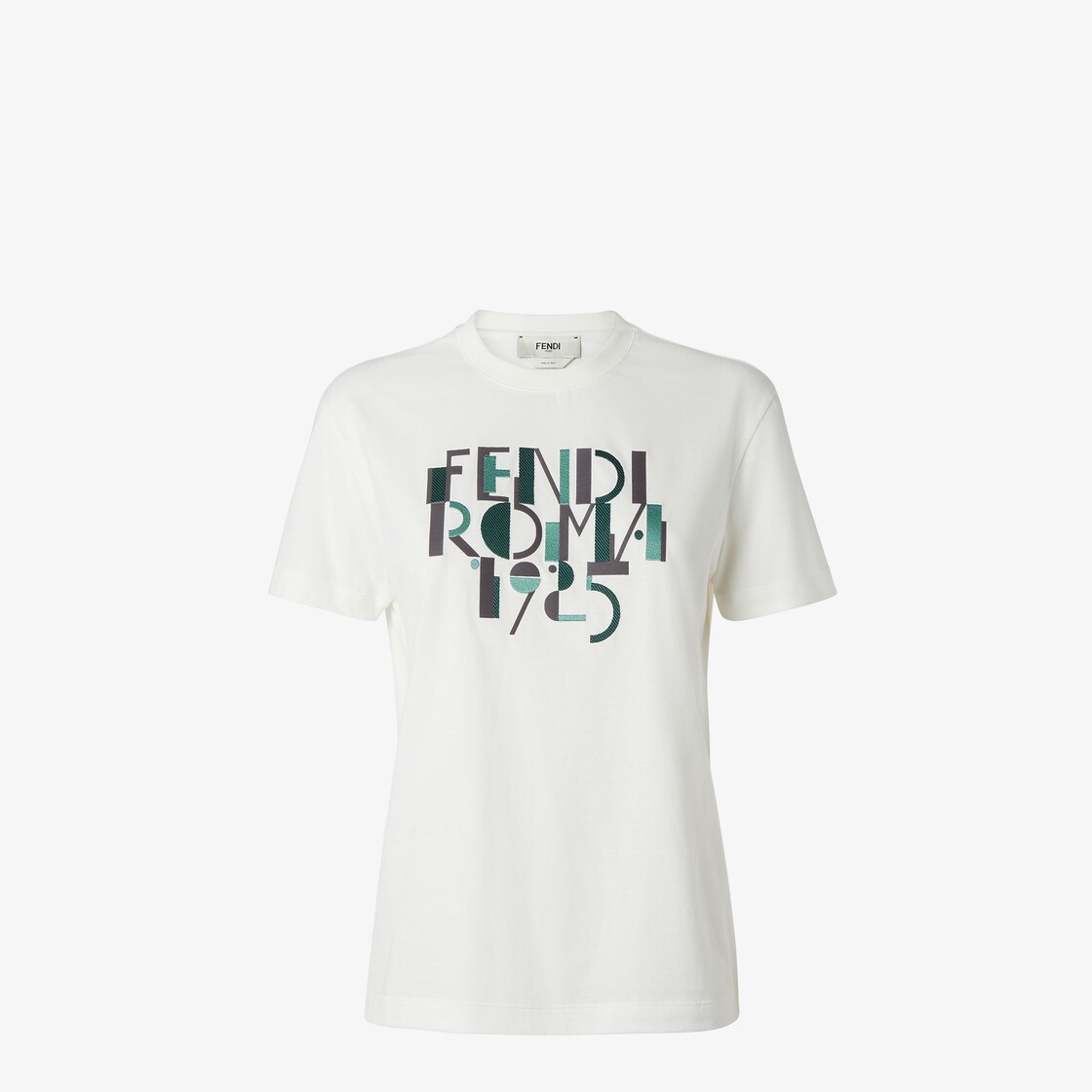 Regular-fit T-shirt with crew neck and short sleeves. Made of white cotton jersey. Customised with the Fendi Roma 1925 print and green embroidered details, inspired by the geometric aesthetic of the 1920s and the graphic patterns of the Fendi fashion show in 2000.