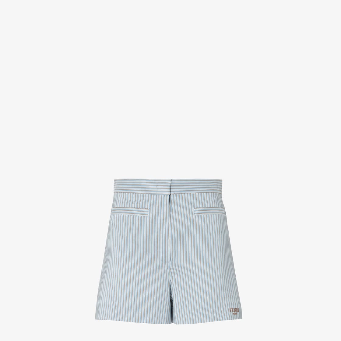 Straight-cut shorts with welt pockets on the front. Trouser crease. Concealed zip and hook fastening. Made in light blue silk and cotton with contrasting pinstripe motif. Embellished with a contrasting Fendi Roma lettering embroidered at the hem.