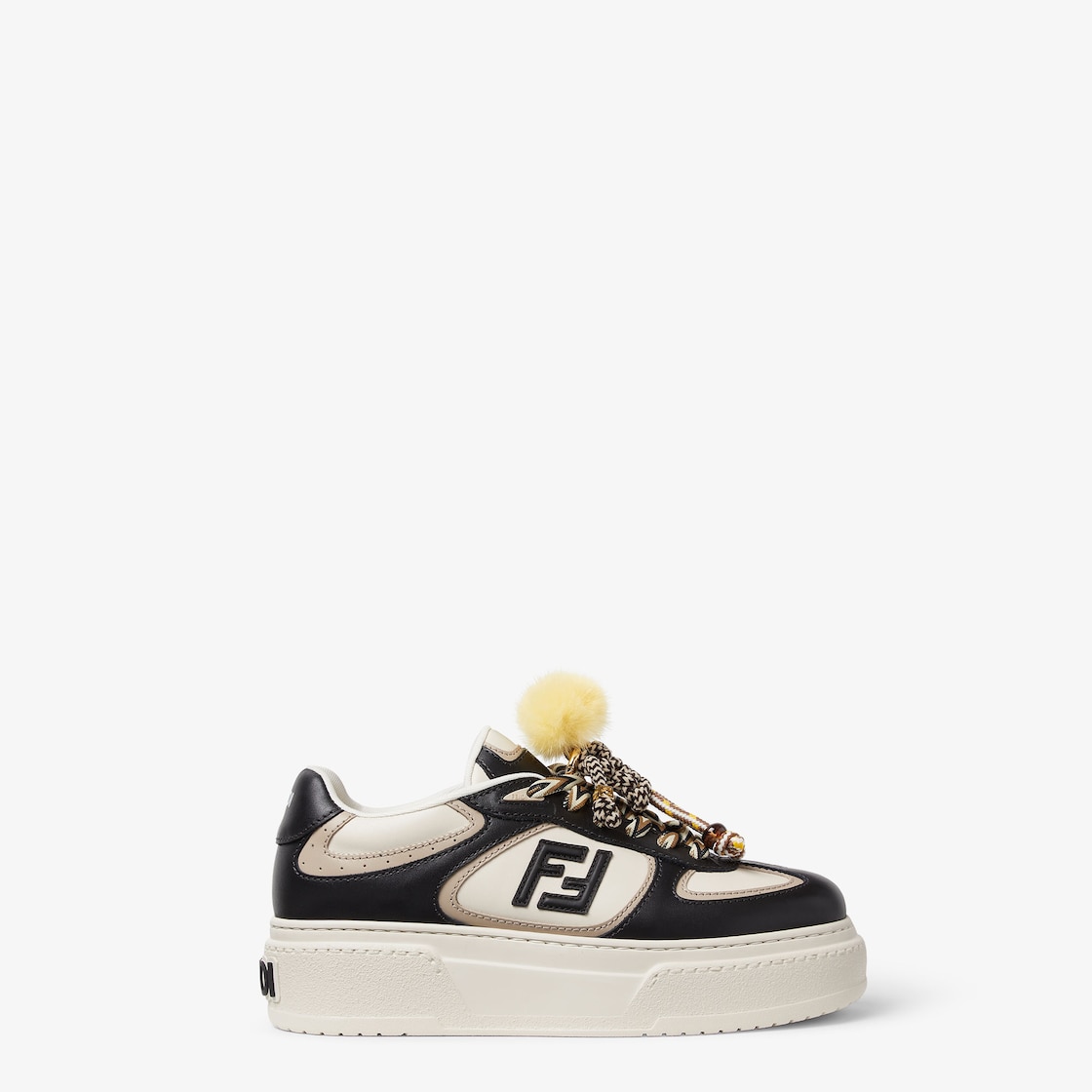 Fendi Match lace-up trainers. Made of black and white leather. Black leather FF appliqué on the sides and multicolour laces. Rubber platform sole with oversized, embossed Fendi lettering at the back. Completed with charms attached by a metal ring onto the tongue: the right shoe is adorned with a small doll in braided cord with yellow mink details and bracelets with FF motif in gold metal. On the left shoe is a braided cord scoubidou with contrasting mink double pom-pom, completed by a metal FF bead, and tag with printed Pequin motif and logo.
