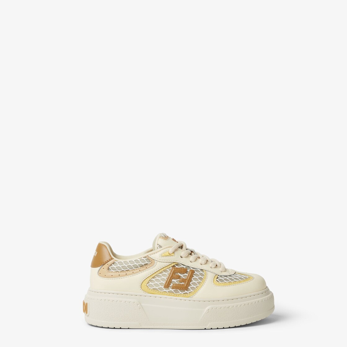 Fendi Match lace-up trainers. Made of cream leather with white technical mesh details for a two-layer effect. Contrasting leather details and FF appliqué on the sides in yellow and light and dark beige. Hiking laces to match the shoe. Rubber platform sole with oversized, embossed Fendi lettering at the back.