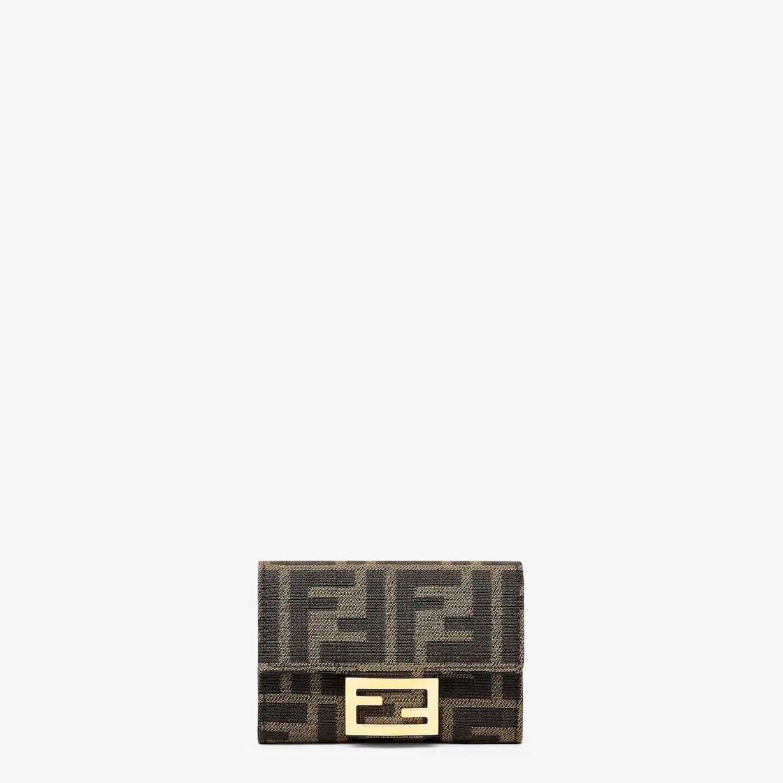 Compact Baguette wallet with flap and iconic twist lock. Organised into three gusseted compartments for credit cards. Made of fabric with iconic brown jacquard FF motif. Dark brown leather lining. Gold-finish metalware.