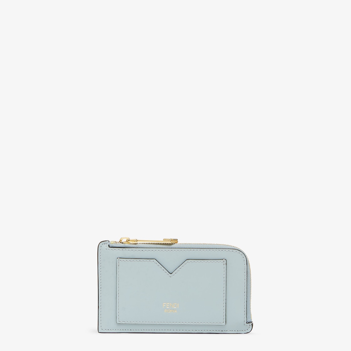 FF Diamonds card case with four back card holder slots, a central zipped compartment and front card holder. Made of light blue calfskin. Metalware and FENDI logo in gold-finish metal.