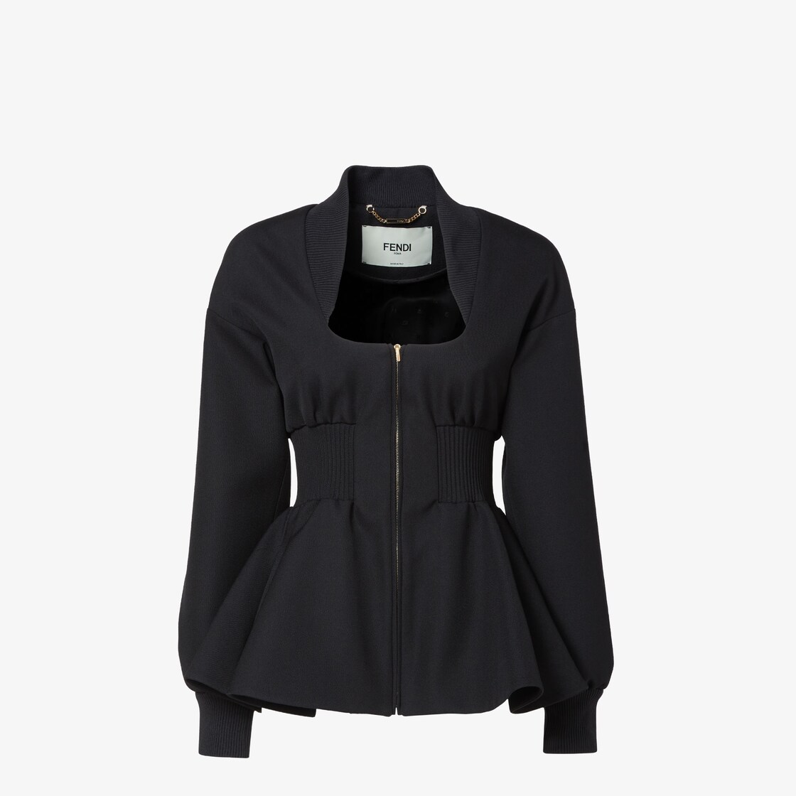Chaqueta con corte de sastrería, péplum en el bajo y cintura elástica acanalada. El modelo presenta escote cuadrado, manga con sisa caída y cuello y puños de punto acanalado. Cierre con cremallera de metal en toda su longitud. Confección en grain de poudre de lana negra.