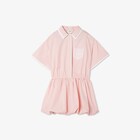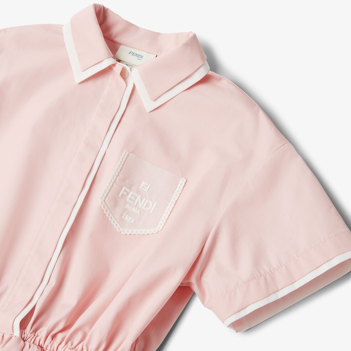 Vestido júnior de silueta globo en popelina rosa con detalles de organza blanca con bordado Fendi en cuello, botones y bolsillo. Cintura con elástico interior.