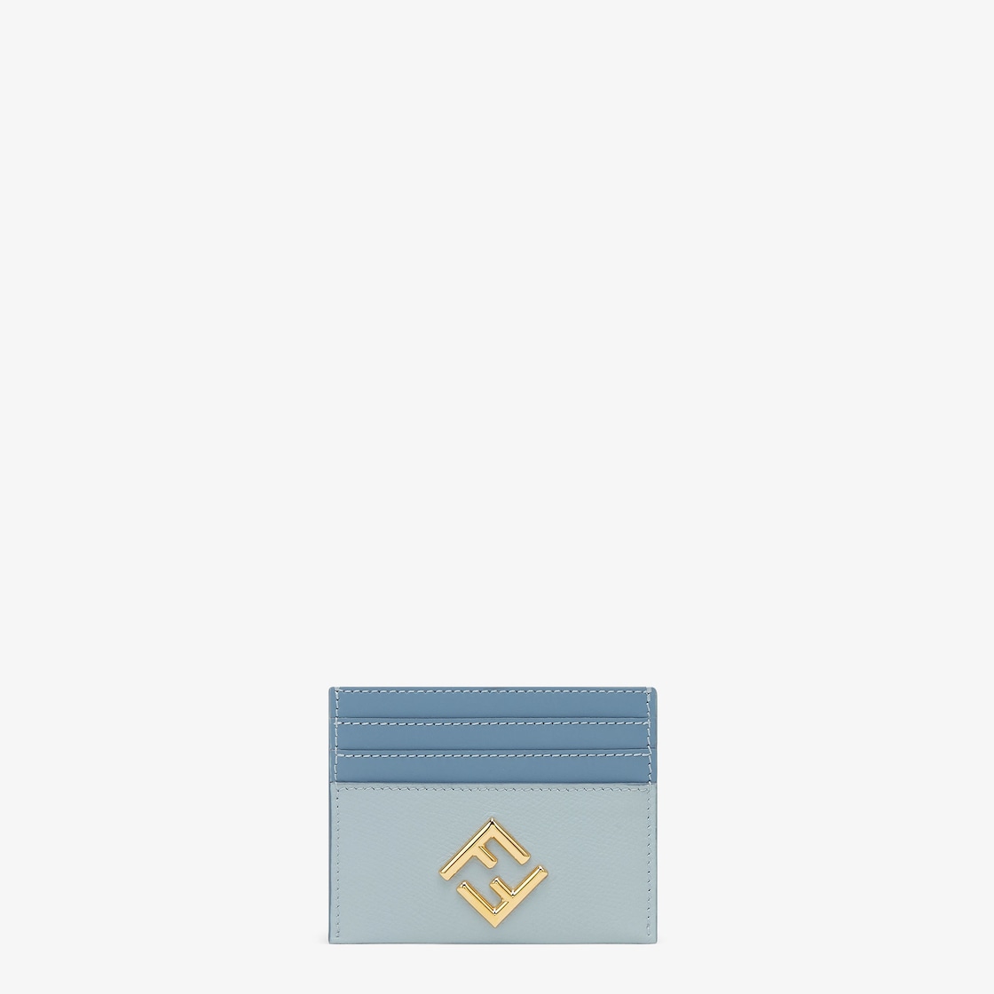Tarjetero FF Diamonds con logo FF diagonal, compartimento central y 6 ranuras para tarjetas. Confección en piel de becerro lisa y granulada en tonos azul claro. Accesorios de metal con acabado dorado.