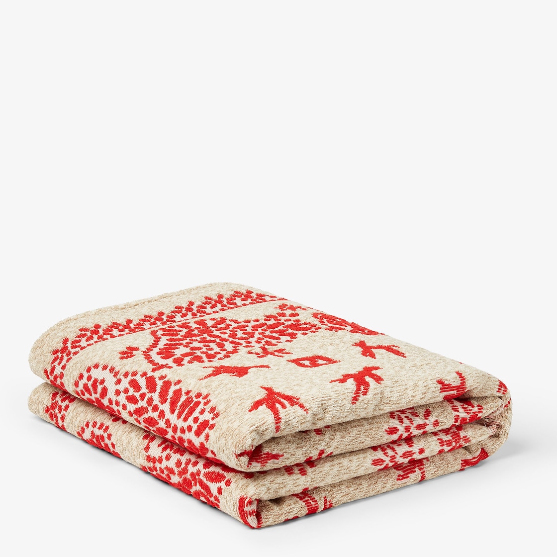 Toalla de playa de suave algodón con motivo Coral Bandana inspirado en la colección de verano. La elaboración en jacquard con hilos mouliné en contraste aporta una textura única y matices de color que realzan los detalles de la trama. La base camelia está adornada con toques rojos que resaltan los detalles de flores, corales y micro FF. Acabada con flecos en los dos extremos.