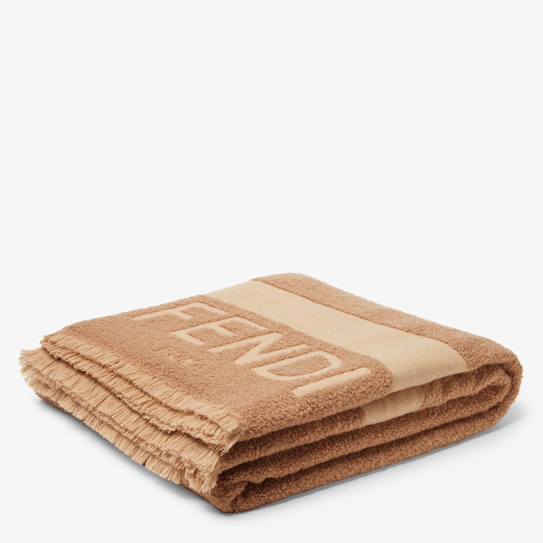 Manta rectangular de cashmere bouclé y lana fina con una sofisticada textura diagonal. Está inspirada en el sofá de Fendi Casa del mismo nombre y se caracteriza por reinterpretar las icónicas FF de FENDI, transformándolas en un perfecto abrazo entrelazado. La combinación de la mezcla de elaboraciones en tonos marrón claro y beige crea un efecto táctil increíblemente agradable, así como un equilibrio ideal entre elegancia y comodidad. Modelo acabado con pequeños flecos en los extremos.