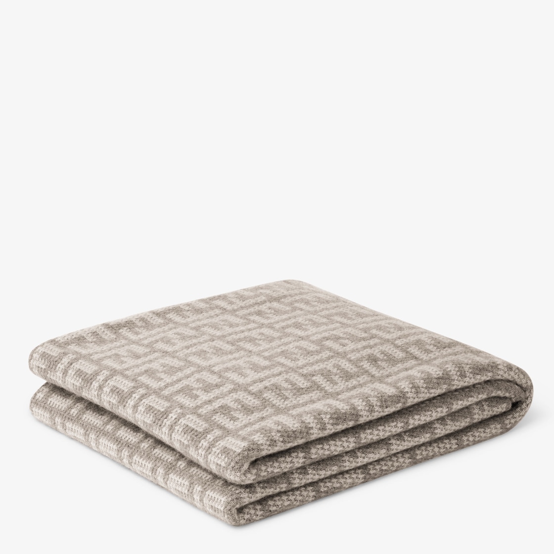 Manta confeccionada en cashmere bicolor en sus tonos naturales gris paloma y blanco, y con motivo FF. El logo FF, diseñado por Karl Lagerfeld en el año 1965, se convierte en un elemento gráfico y decorativo que consolida la estrecha relación entre el mobiliario y el mundo de la moda. La exquisita elaboración y sus materiales sofisticados la convierten en una manta sumamente suave y lujosa, y los motivos gráficos icónicos la transforman en un auténtico objeto de diseño.