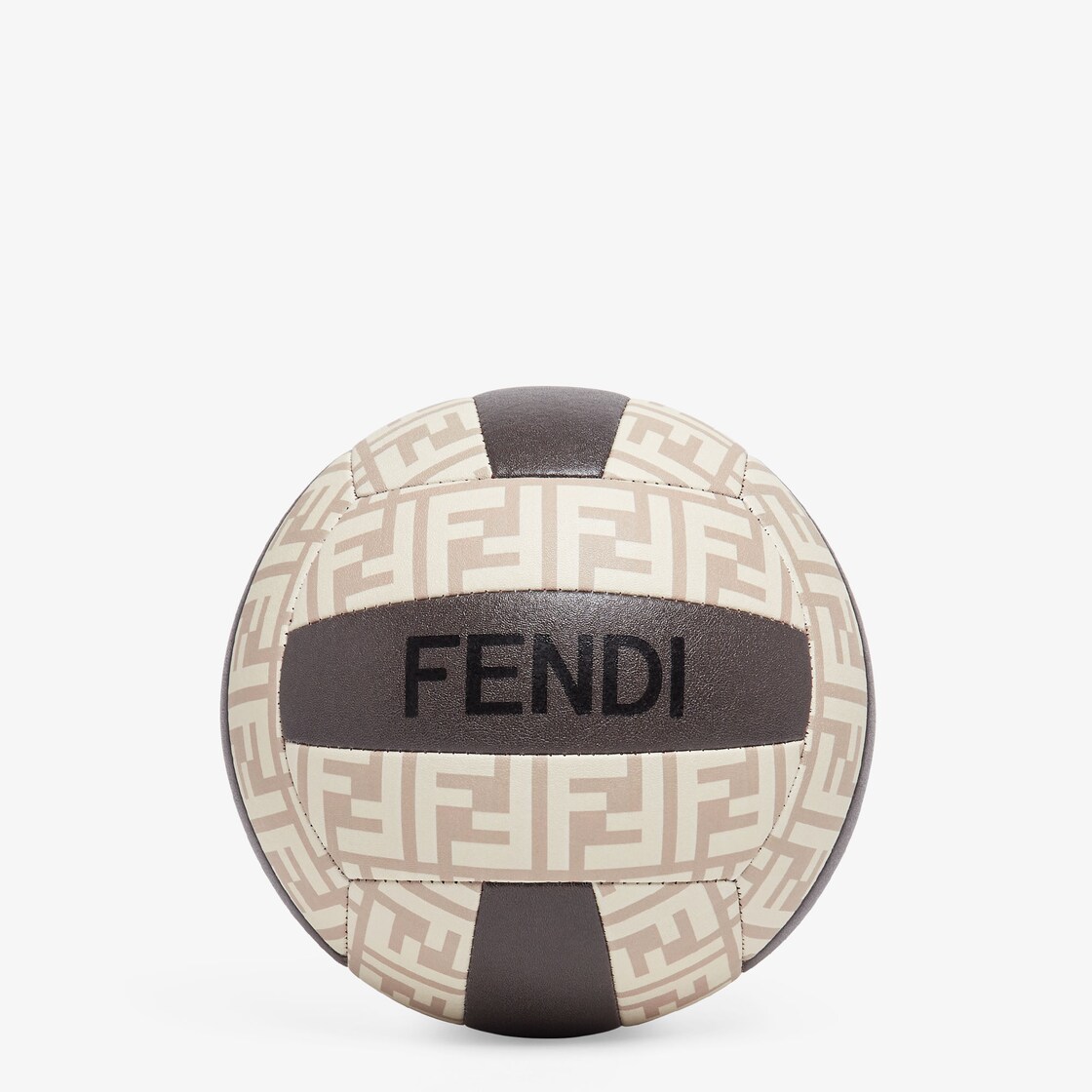 Pelota de voleibol de playa. Fabricado con piel en dos secciones marrón y beige, además del motivo FF. Adornado con la inscripción Fendi Roma.