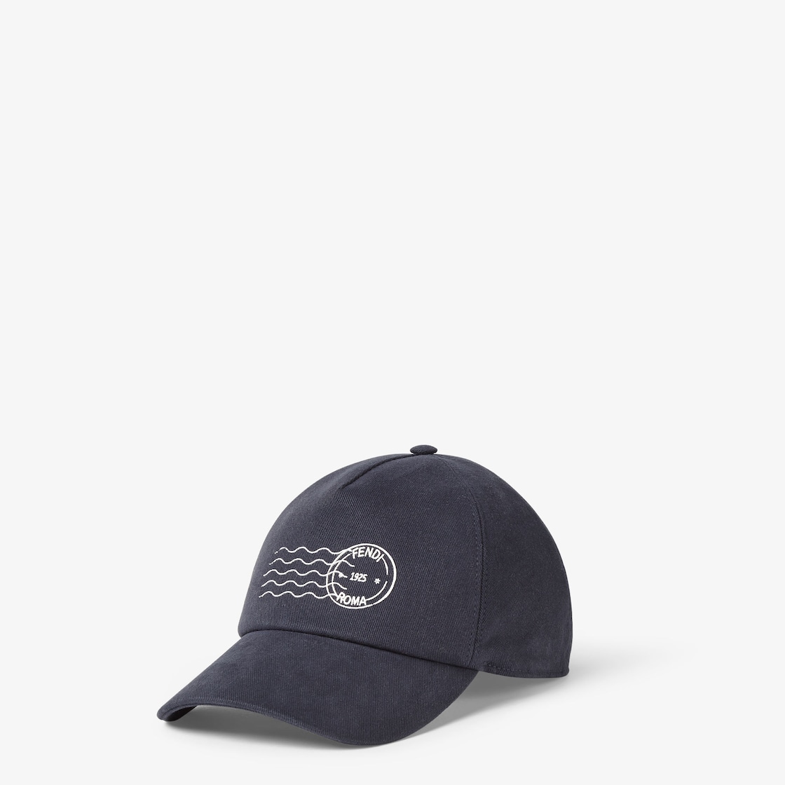 Gorra modelo béisbol con visera semirrígida confeccionada en lona azul oscuro. Modelo personalizado con motivo Fendi Postcards bordado en contraste en la parte delantera.