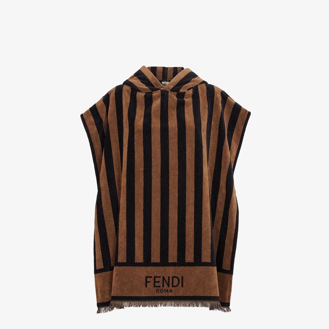 Poncho corto con capucha. Confección en suave tejido de rizo de algodón puro que reproduce un motivo integral de rayas Pequin en tonos marrones. Acabado con banda en contraste adornada con la inscripción Fendi en jacquard en el bajo. Bajo desflecado.