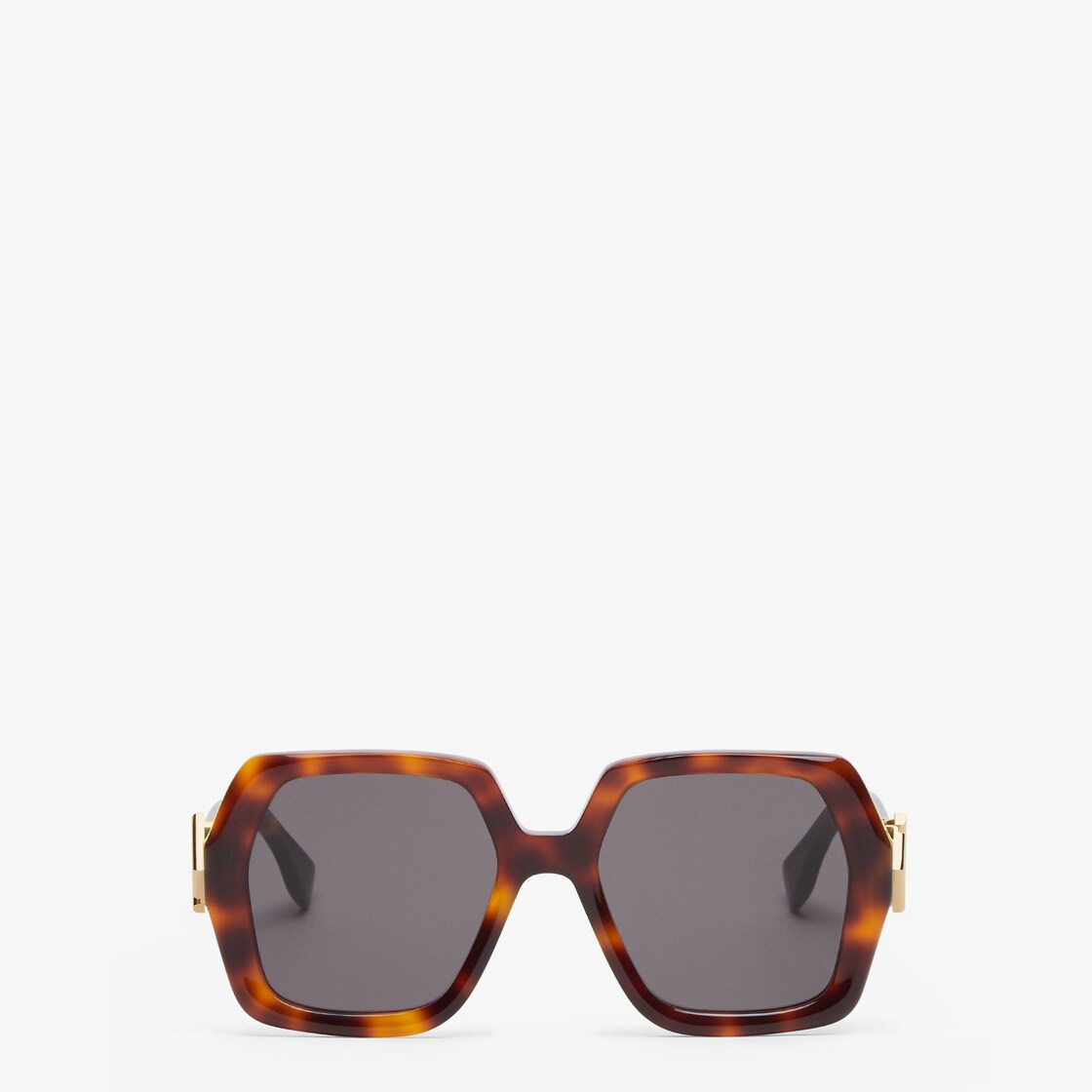 Gafas FF Diamonds de forma cuadrada extragrande en acetato habana. Patillas con bisagra FF Diamonds funcional de metal color dorado. Lentes grises.