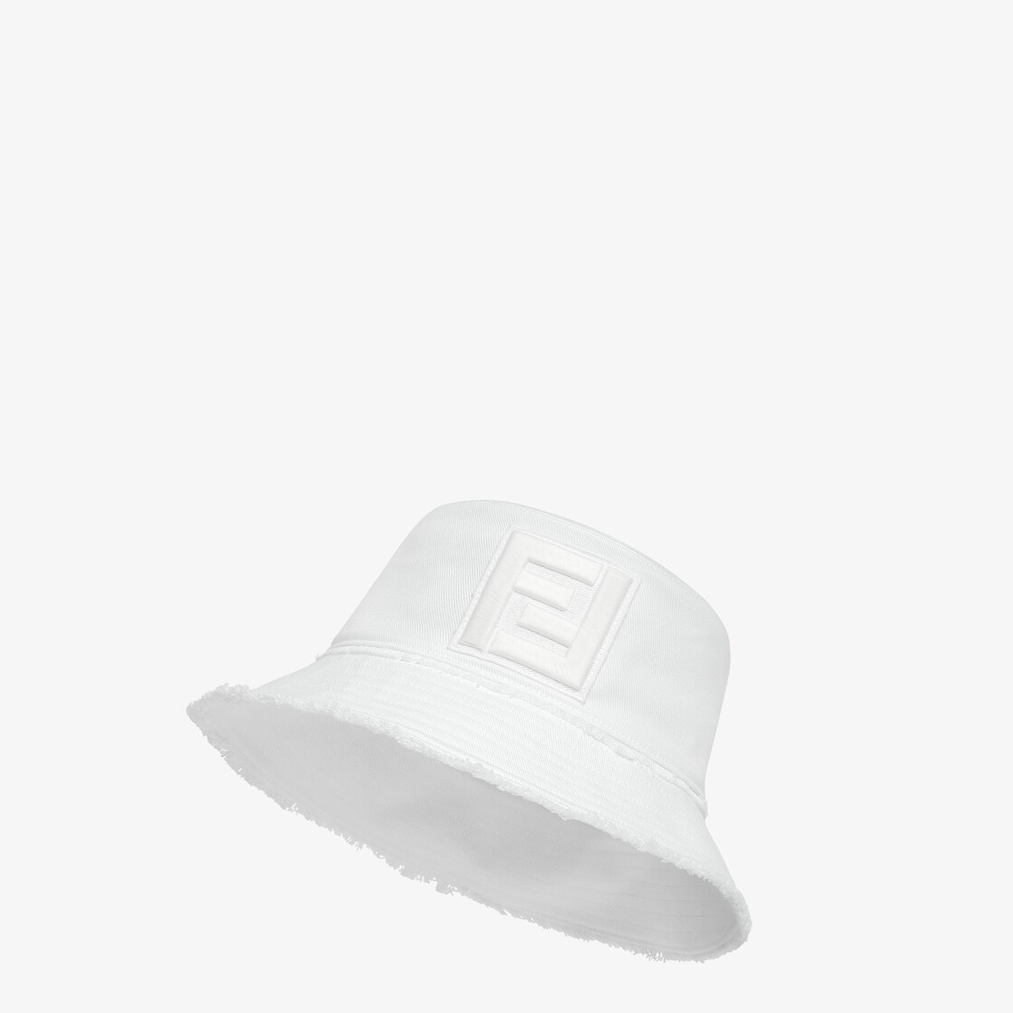 Gorro modelo bucket de ala estrecha. Confección en denim de algodón blanco. Modelo acabado con bordes deshilachados y maxilogo FF bordado a tono en la parte delantera.