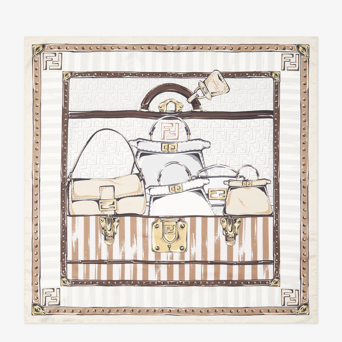 Pañuelo cuadrado que forma parte de la colección realizada con la colaboración del diseñador Stefano Pilati y está confeccionado en sarga de seda en tonos beige y grises. El estampado Fendi Iconic Bags presenta algunos de los accesorios más emblemáticos de la marca. Cinco bolsos, Baguette y Pequin, contenidos en un baúl de inspiración vintage decorado con un patrón a rayas Pequin. El fondo está adornado con el icónico logo FF tono sobre tono. Presenta bordes en contraste con detalles a rayas y logo FF. Bordes enrollados a mano.