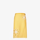 Falda de largo medio de corte recto. El modelo se caracteriza por las cremalleras largas de doble cursor en contraste que recorren ambos lados. Confección en organza de seda color amarillo claro, con motivo Fendi Ajour acabado con bordes en tonos blancos y forro de organza ligera tono sobre tono. Los detalles calados y el juego de texturas crean un efecto tridimensional con un fuerte impacto visual.