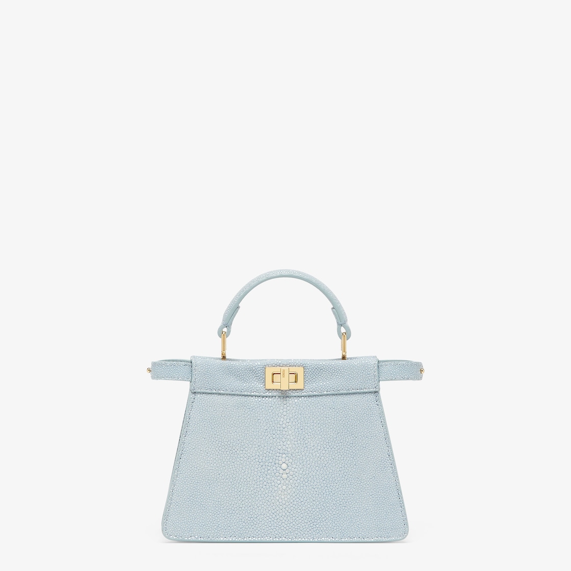 Icónico bolso Peekaboo ISeeU en un tamaño compacto ideal. Confección en piel exótica de mantarraya color azul claro esmerilada a mano. Decorado con el inconfundible cierre de giro en ambos lados.