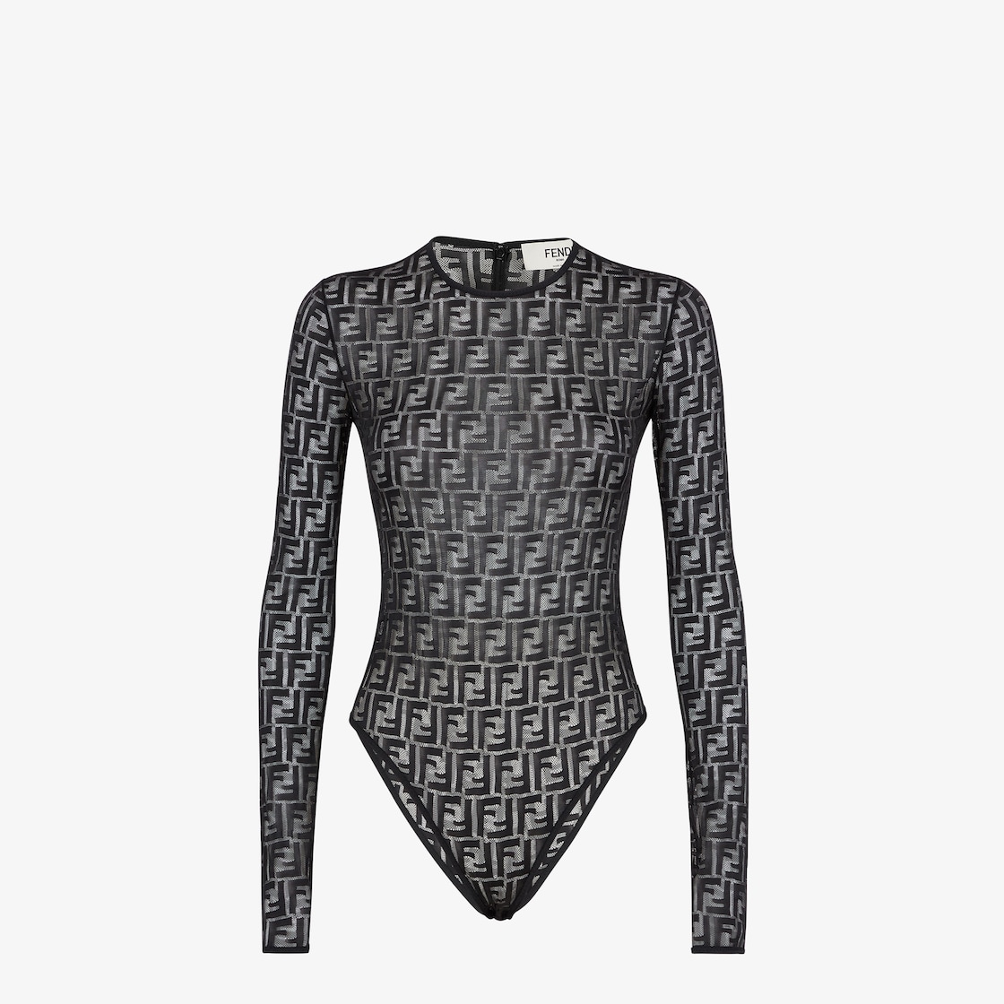 Body de corte ceñido con escote redondo y manga larga. Presenta cierre de media cremallera en la parte trasera. Confección en encaje con motivo FF en tonos negros por toda la superficie.