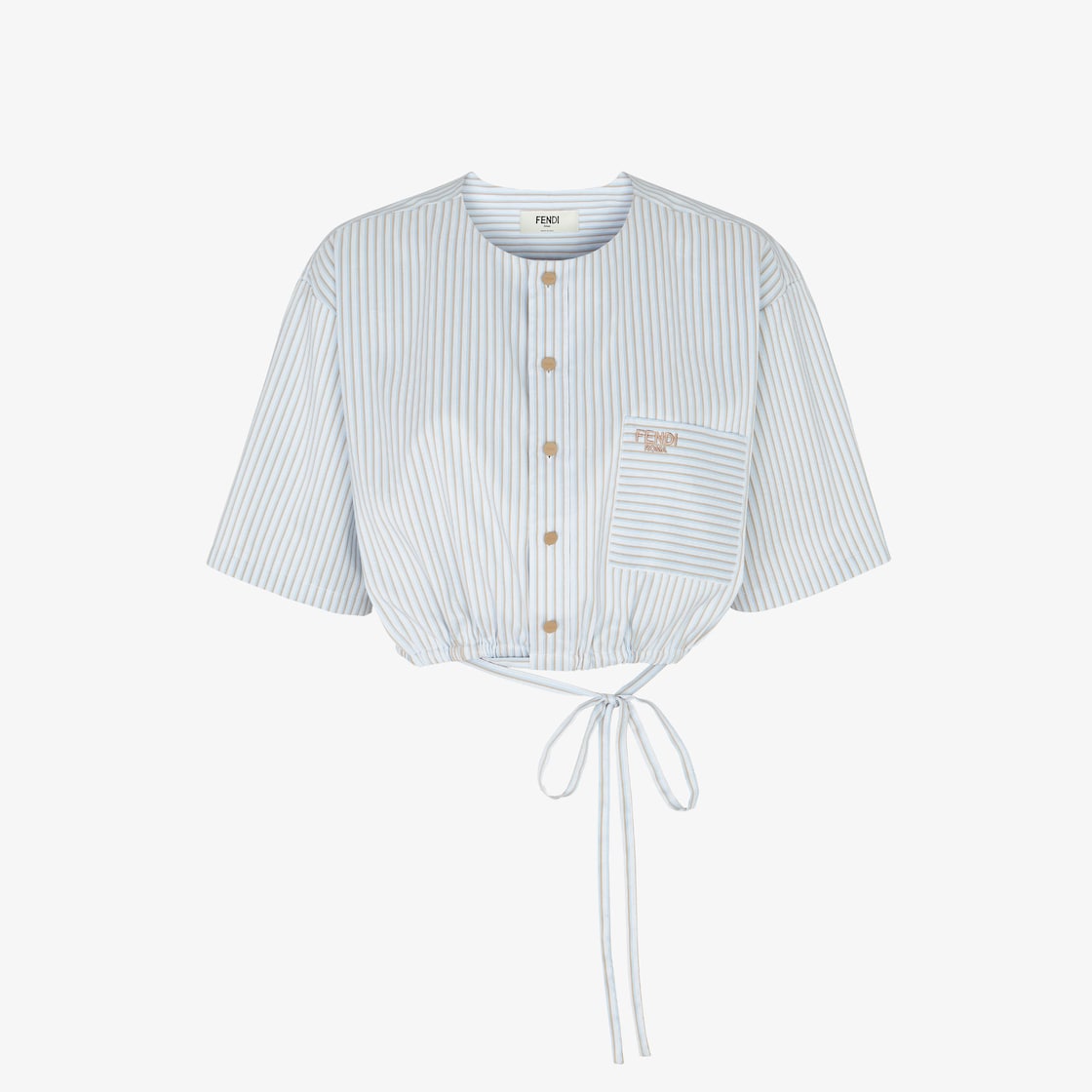 Camisa corta con borde elástico y cintas para atar con doble vuelta en la cintura. Cuello redondo y manga corta con hombro caído. Cierre delantero con botones vistos con logotipo. Confección en algodón y seda azul claro, con motivo a rayas en toda la prenda estampado en contraste. Modelo acabado con bolsillo pequeño aplicado en el pecho con inscripción Fendi Roma bordada en contraste.
