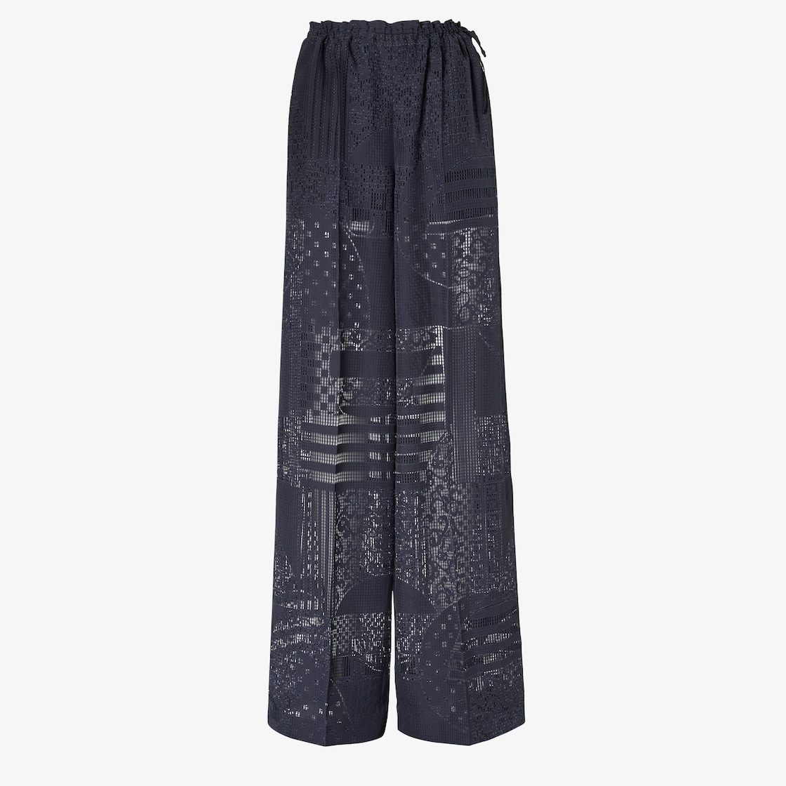 Pantalón estilo pijama de corte recto con cordón ajustable en la cintura con cintas que se anudan a los lados. Pliegue planchado y bolsillos laterales. Semiforrado. Confección en viscosa y seda azul, con motivo de patchwork devoré que reproduce una mezcla de logotipos y motivos de archivo.