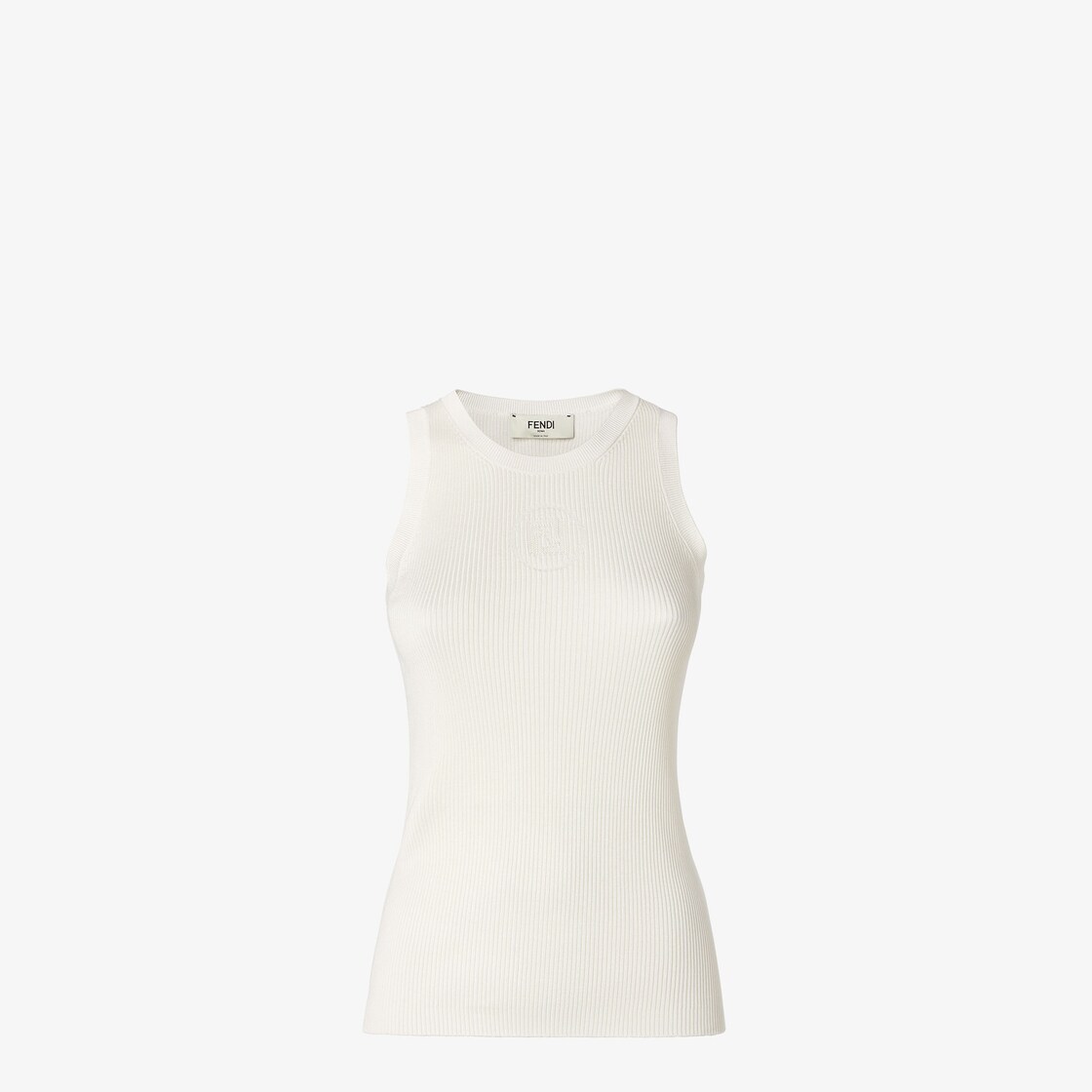 Top sin mangas de corte ceñido. Confección en algodón blanco vanisé con elaboración acanalada sin costuras. Personalizado con discreto motivo Fendi Stamp 1925 devoré en la parte delantera.