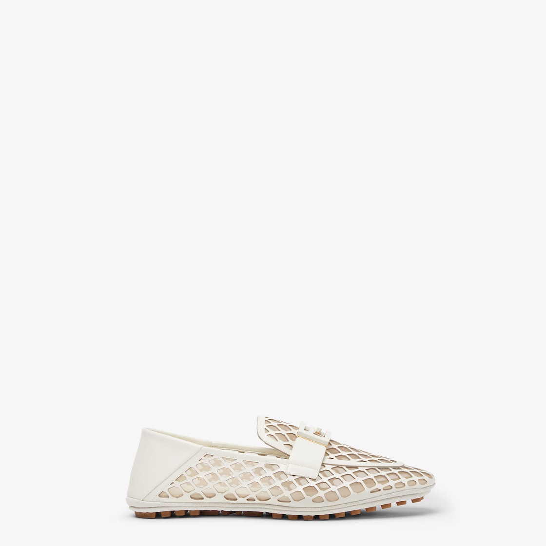 Mocasín driver con motivo FF Baguette. Suela de ante con aplicaciones de goma en relieve. El talón se puede plegar para llevar el calzado como un zueco. Confección en piel blanca con un motivo perforado en la base de malla de color nude con efecto transparencia. Detalle FF esmaltado a tono.