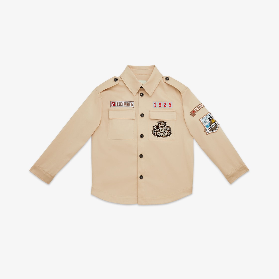 Camisa júnior de gabardina beige con parches multicolor aplicados.