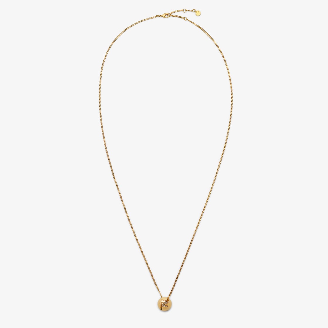 Chain necklace with Fendi Sphera element and inserted crystal. Small snap hook clasp and logo nameplate. Made of gold-finish metal.