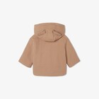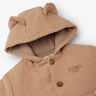 Baby teddy jacket in light brown cotton twill fabric. Hood with ears, front button fastening, and leather label with Fendi teddy bear on the pocket.