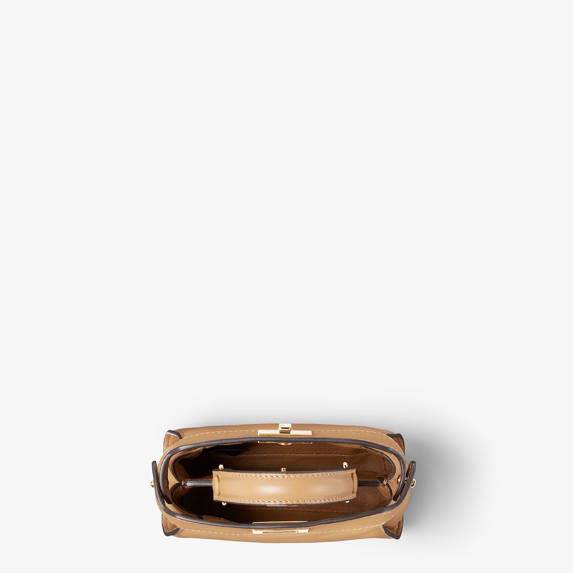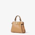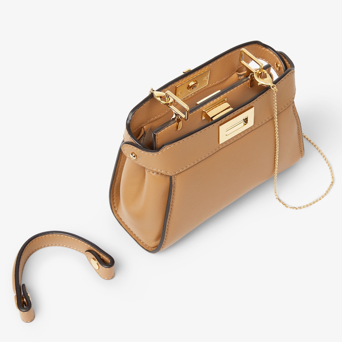 Iconica borsa Peekaboo versione Nano ricreata in ogni dettaglio. Dotata di interni foderati in pelle, due scomparti divisi da una tramezza rigida, manico rimovibile dotato di due bottoni a pressione e iconica chiusura a girello. Può essere portata a mano o cross-body grazie alla sottile tracolla a catena. Realizzata in nappa di colore cappuccino. Accessori metallici con finitura dorata.