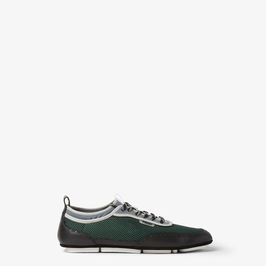 Low top stringata Fendi Fit. Realizzata in mesh leggero verde petrolio e morbida pelle nera, rifinita con macro impunture tono su tono fatte a mano, emblema dell’iconica lavorazione Selleria, tramandata dagli artigiani Fendi sin dal 1925. La costruzione flessibile a sacchetto con inserto in tessuto scuba e linguetta sul tallone garantisce un comfort ottimale. Lacci tricolore caratterizzati da motivo trekking. Suola con iniezioni in gomma a contrasto colore, caratterizzate dal motivo Fendi.