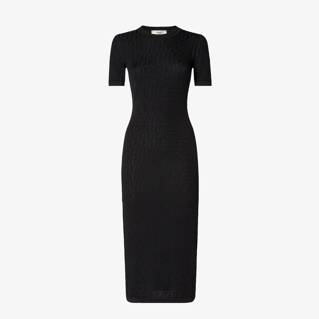 Abito midi a maniche corte dalla linea aderente. Realizzato in filato di cotone e viscosa di colore nero, con l'iconico motivo FF stampato all over nelle stesse tonalità. Rifinito con girocollo a costine.